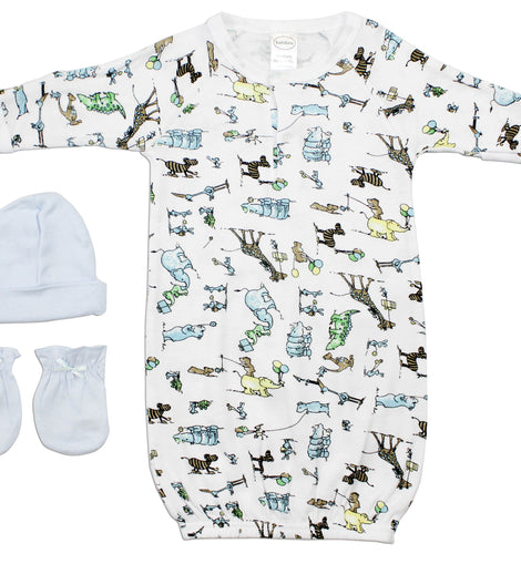 Unisex Print Gown (100% Cotton), Blue Baby Cap (100% Cotton), Blue Infant Mittens (Jersey)